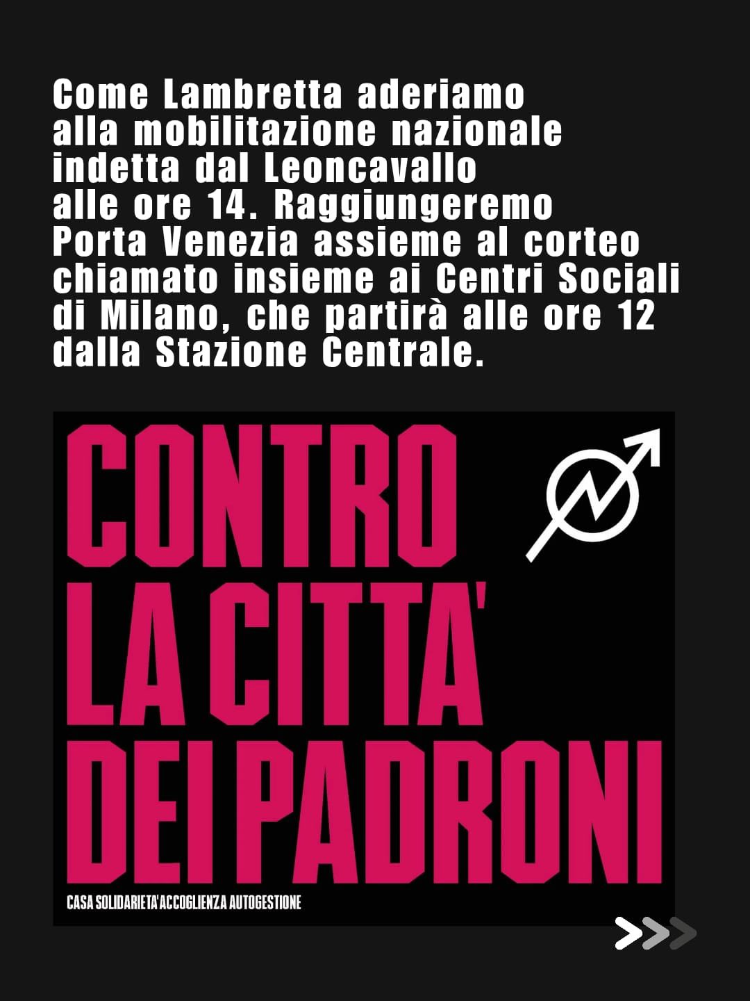 Ieri sera partecipazione delle grandi occasioni alla Camera del Lavoro per l'assemblea pubblica indetta dal Leoncavallo in vista della manifestazione di sabato 6, per cui l'auspicio è di replicare il successo di quella del dicembre 1995 in risposta a un altro blitz delle forze dell'ordine. Ma in pentola bolle molto altro, a cominciare dalla mobilitazione nazionale chiamata sempre per sabato da numerosi centri sociali milanesi...