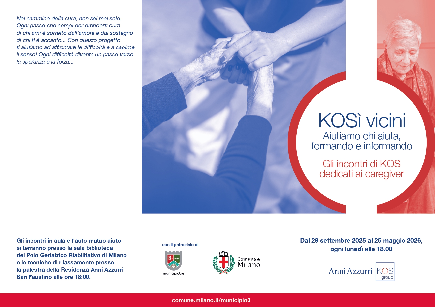 KOSì viciniUn ciclo di incontri formativi e informativi, denominato "KOSì vicini", organizzato in collaborazione con il Gruppo KOS (Residenza Anni Azzurri San Faustino e Polo Geriatrico Riabilitativo di Milano) con il patrocinio del Municipio 3